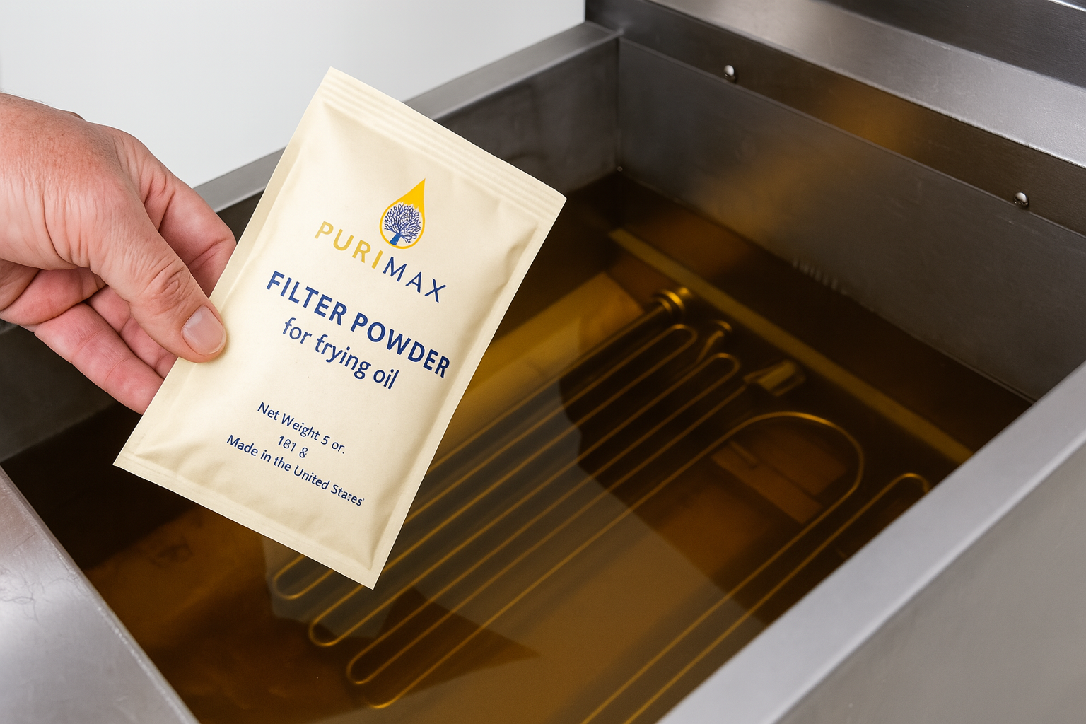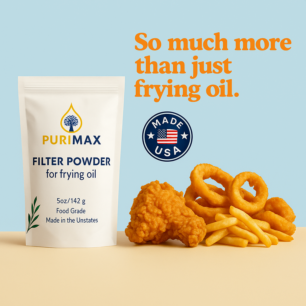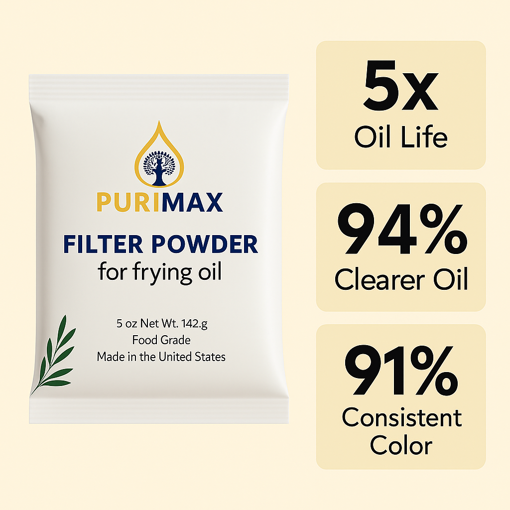 PuriMax™ Filter Powder—the food‑grade treatment that keeps fryer oil at peak performance. Simply sprinkle it straight into hot oil (no extra pumps or paddles) and watch impurities sink, leaving zero cloudy residue. The result? Consistently crisp, golden fries shift after shift, up to 10× longer oil life*, and thousands saved on oil purchases and waste hauling—so your kitchen stays greener and your bottom line healthier.